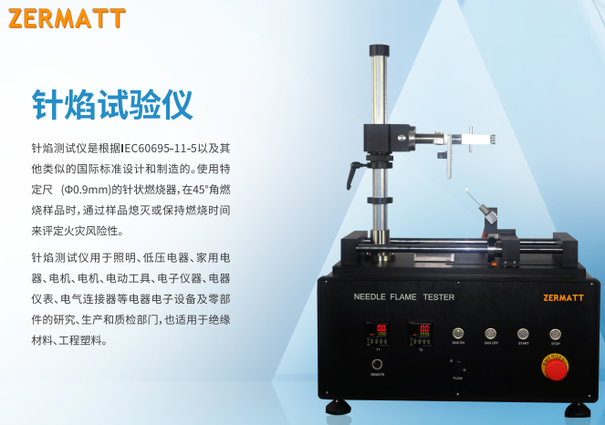 針焰測試儀是根據(jù)IEC60695-11-5以及其他類似的國際標(biāo)準(zhǔn)設(shè)計和制造的。使用特定尺 (Φ0.9mm)的針狀燃燒器,在45°角燃燒樣品時,通過樣品熄滅或保持燃燒時間來評定火災(zāi)風(fēng)險性。